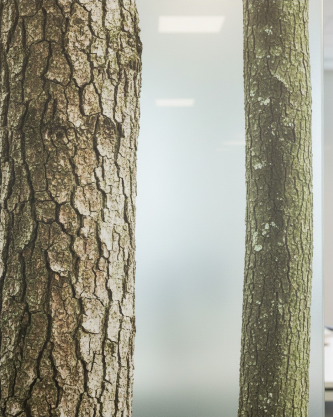 100% Tactile Realism: The custom-printed film features hyper-realistic tree trunk textures that provide a 3D visual effect, offering the authentic look of a forest landscape within a professional setting.